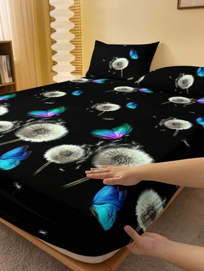 1pc Fashionable Simple Style Dandelion Butterfly Printed Brushed Fitted Sheet Cover Dust-Proof Cover For Bedroom Home Textile Bedding - Multicolor - View 1