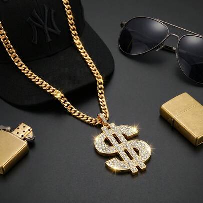 Một chiếc vòng cổ dạng dây chuyền có họa tiết hình dấu đô la, đính đá quý, mạ vàng giả, theo phong cách . | Phụ kiện trang sức phong cách đường phố hip-hop mùa hè | Phù hợp cho cả nam và nữ, có thể dùng làm phụ kiện hàng ngày và trong các bữa tiệc.
