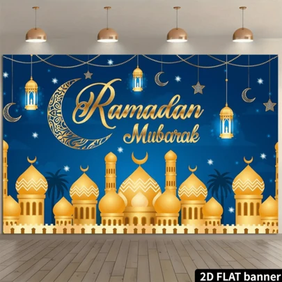 One Ramadan Mubarak-Themed Blue And Gold Muslim Karim Party Banner, Featuring Islamic Architectural Design, Ramadan Festival Decorations, And Photo Booth Props - Blue - View 1