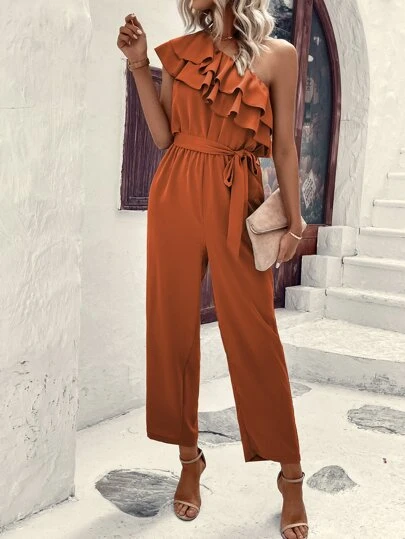 Chiquease One Shoulder Ruffle Trim Belted Jumpsuit - Burnt Orange - View 1