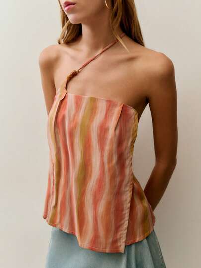 Nöista Áo lệch vai họa tiết sọc màu nước mềm mại với chi tiết đính hạt ở dây đeo có thể điều chỉnh. Nhẹ nhàng và dễ phối với quần jean hoặc chân váy. Hoàn hảo cho trang phục mùa hè, kỳ nghỉ, tiệc bể bơi, phong cách boho, lễ hội âm nhạc, đồ đi biển.