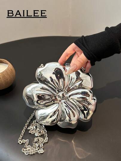 BAILEE Metallic Flower Shaped Dinner Bag Dance Party Wedding Dress Handbag Lipstick Change Makeup Bag Accessory Bag With Metal Chain Can Diagonally Cross Avant-Garde Women's Gift - Silver - View 1
