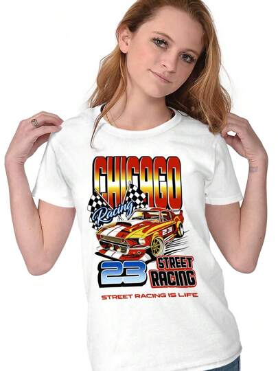 Trucker Womens Fitted Graphic Tee Shirt Cool Chicago Drag Speed Street Racing Is Life Racecar Number 23 Ladies Casual Slim Fit Fashion Cotton Printed Short Sleeve Crewneck Tshirt Brisco Brands - White - View 1