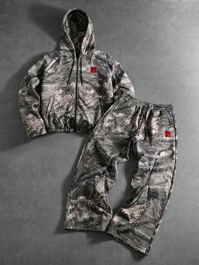 PAVTROS Men's Casual Fashion Street Full Print Zip-Up Drawstring Hooded Sweatshirt And Wide-Leg Sweatpants Set, Spring/Autumn Men 2 Piece Set Camo 2 Piece Set Men - Multicolor - View 1