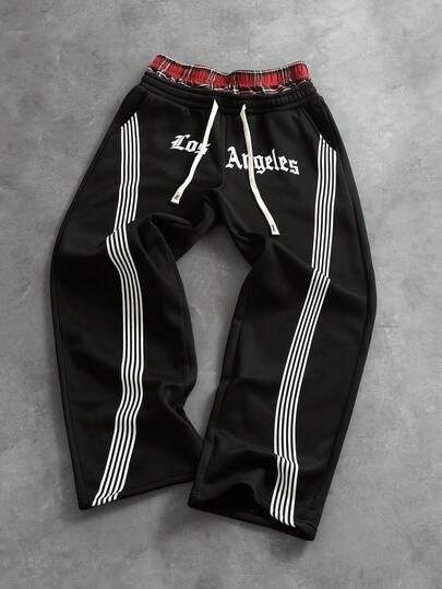 PAVTROS Men's Loose Fit Striped & Letter Print Pants - Black - View 1