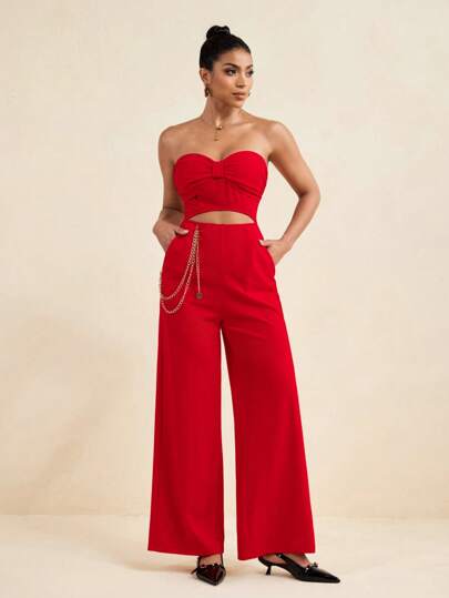 PHXTHREADS Red Strapless Gold Chain Cut Out Wide Leg Jumpsuit For Women Summer Outfit Vacation Holiday - Red - View 1
