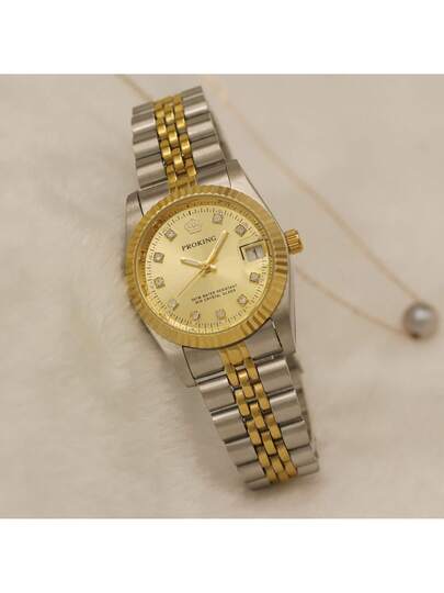 PROKING Authentic Ladies Watch, Business Luxury Elegant Waterproof Stainless Steel Rhinestone Calendar Quartz Watch, Versatile Birthday Gift - Gold - View 1