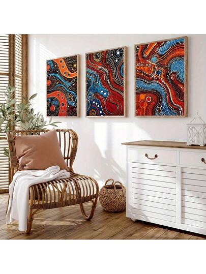 3pcs Set Frameless Vintage Aboriginal Art Canvas Prints, Apricot Color, Indigo Wall Art For Living Room, No Electricity Needed, Modern Indigenous Artwork Decor Gifts Birthday Graduation - 3PCS - View 1
