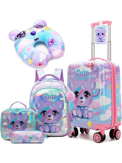 Kid's Luggage Set 5 Piece Suitcase Set 16' Hardside Spinner Wheels Girls Carry On Toddler Travel Rolling Airline Approved - Blue Purple Bear LXX4006 - View 1