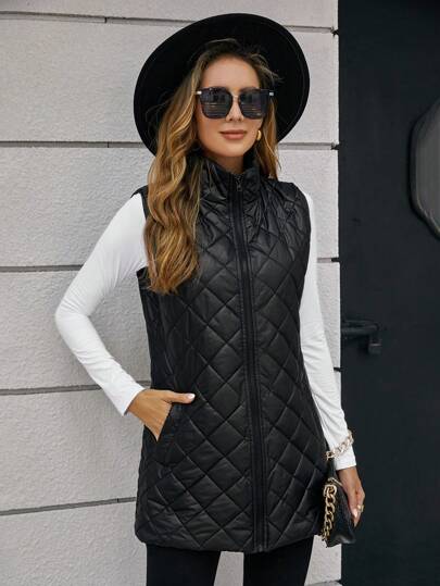SHEIN Clasi Slant Pockets Sleeveless Argyle Quilted Vest Coat In Fall/Winter - Black - View 1