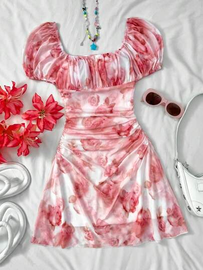 SHEIN Teen Girls Spring& Summer/Valentine Day/Dreamara Pink Floraldress/Vacation/Holiday/Vintage//Beach/Sea/Elegant/Dresses For Girl/Bohemia/Boho Clothing/Sun Dresses For Girls Summer Dress Floral Dress Rose Print Dress Pink Dress Dress Summer - Pink - View 1