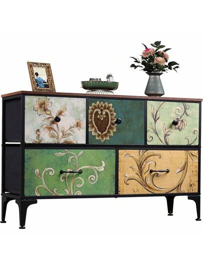 Dresser For Bedroom With 5 Drawers, Wide Chest Of Drawers, Fabric Dresser, Storage Organizer Unit With Fabric Bins For Closet, Living Room, Hallway - Floral Painted - View 1