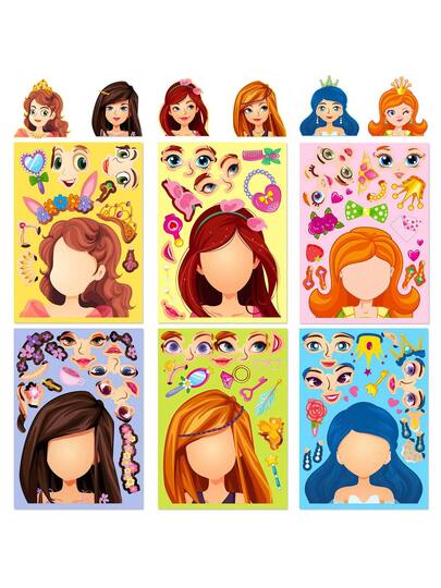 1 Pack Of 6 Blue Princess Swap Face Sticker Cartoon Parent-Child Interactive Puzzle Adhesive For Scrapbooking DIY - Multicolor - View 1