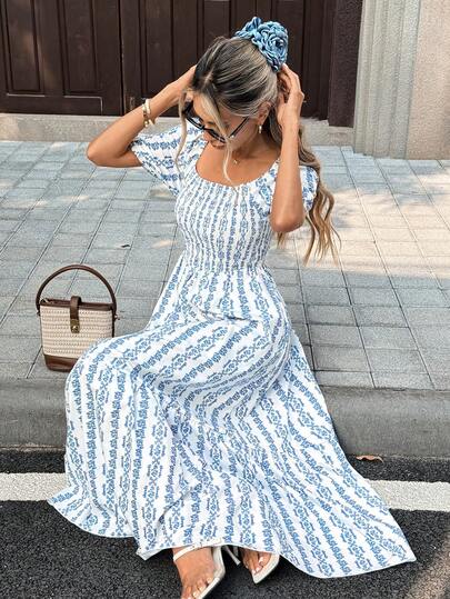 Pariaura Women's Casual All-Over Print Square Neck Dress - Blue and White - View 1