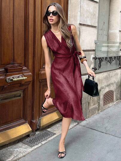 Pariaura Women's Navy Blue Elegant Commuter Faux Denim Sleeveless V-Neck Waist Cinched Maxi Dress - Burgundy - View 1