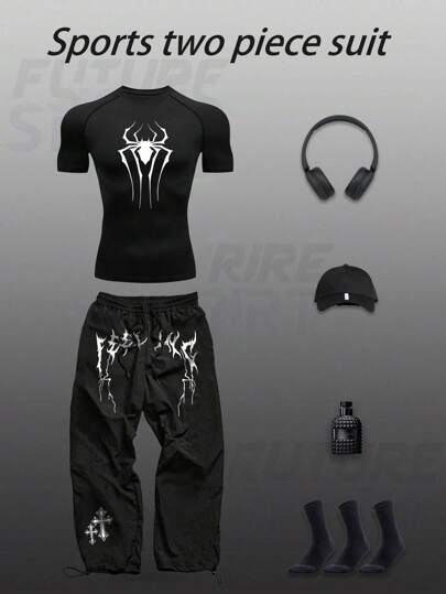 Manfinity Sport Corelite Men's Spider Print T-Shirt And Pants Sports Suit Breathable Sweat-Wicking Comfortable Slim Fit For Workout Training Gym Set - Black - View 1