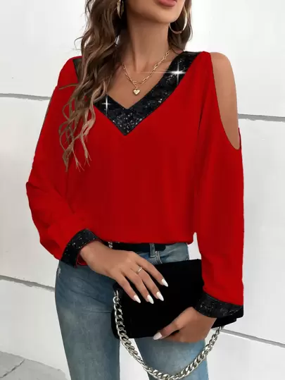 EMERY ROSE Contrast Sequin Cold Shoulder Blouse For New Year Clothes,Long Sleeve Tops Fall Cloth For Women - Red - View 1