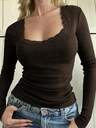 Women's T-Shirt Y2K Fall Clothes Casual Daily Sexy Solid Color Lace Contrasting Color Slim Long Sleeve V-Neck Top