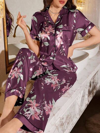 LuxeNights Floral Print Faux Silk Collar Short Sleeve Top & Pants Pajama Set - Purple - View 1