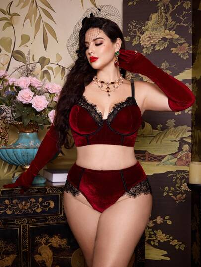 PinupPomp Plus Contrast Lace Velvet Bra & Panty Lingerie Set - Burgundy - View 1