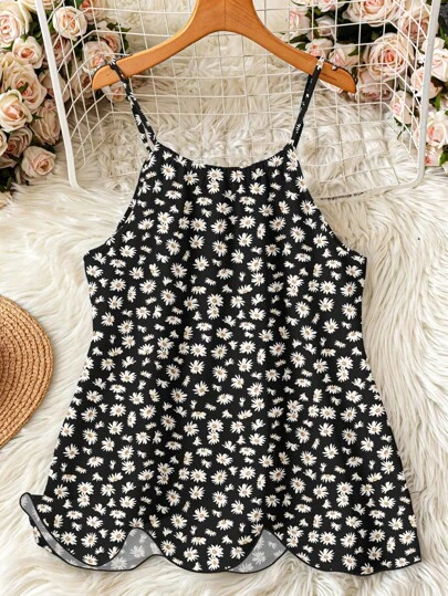 EMERY ROSE Plus Size Women's Summer Bohemian Mother's Day Women's Daisy Floral Vintage Print Camisole Women's Summer Renaissance Fair Top Suitable For Going Out - Black - View 1