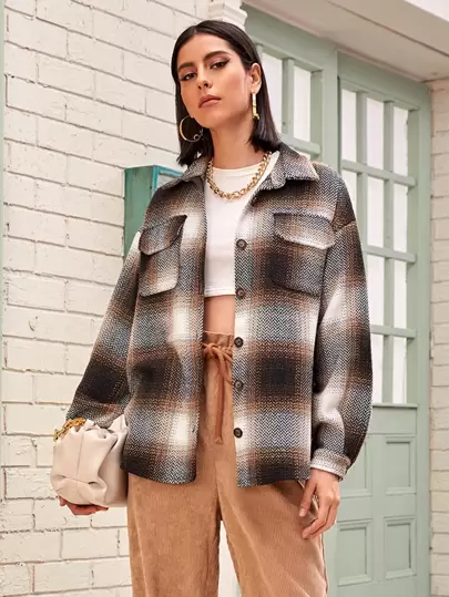 Plaid Flap Pocket Button Up Overcoat - Multicolor - View 1