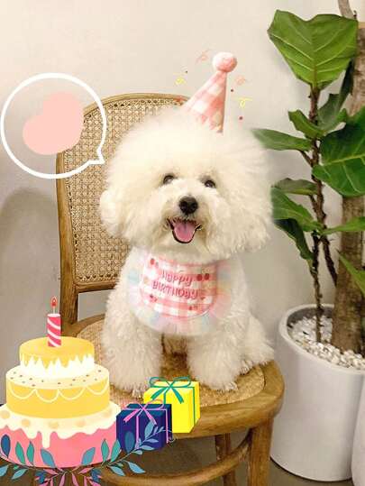 Plaid Lace Pet Birthday Party Scarf + Hat Set, Suitable For Cats & Dogs, Birthday Celebration Gift - Pink - View 9