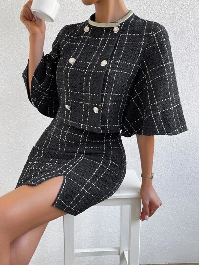 SHEIN Privé Plaid Print Double Breasted Jacket & Split Hem Skirt - Black - View 1