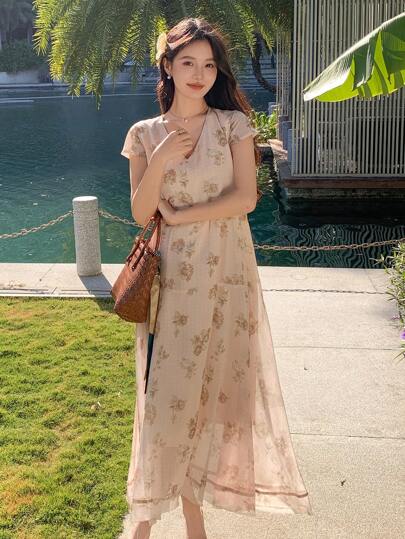 DAZY Plant Print A-Line Mini Dress With V-Neck And Flared Hem, Casual Vacation Style - Beige - View 1