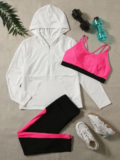 Plus 3pcs Lightweight Contrast Panel Hollow Out Half Zipper Hooded Sports Set - Multicolor - View 1