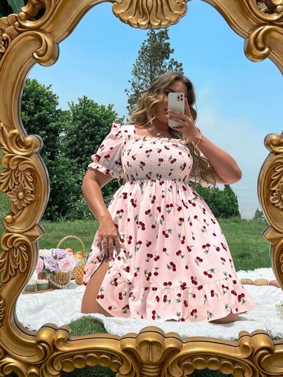 SHEIN Holidaya Plus Allover Cherry Frill Shirred Ruffle Hem Dress - Baby Pink - View 1