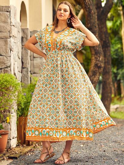 S BETRO Plus Allover Print Batwing Sleeve Dress - Apricot - View 1