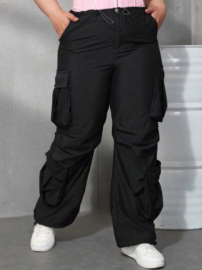 Plus Size Y2K Streetwear Flap Pocket Drawstring Waist Cargo Pants, Wide Leg Loose Parachute Pants, Multi-Pocket Women - Black - View 1