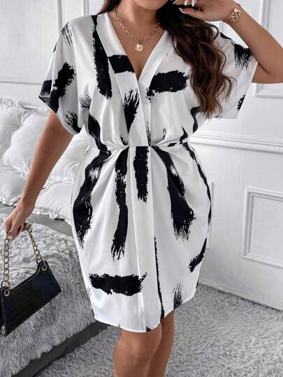 SHEIN Clasi Plus Brush Print Batwing Sleeve Dress - Black and White - View 1