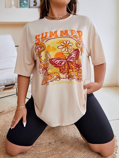 Flirla Plus Size Butterfly & Letter Graphic Drop Shoulder Tee For Summer - Apricot - View 1
