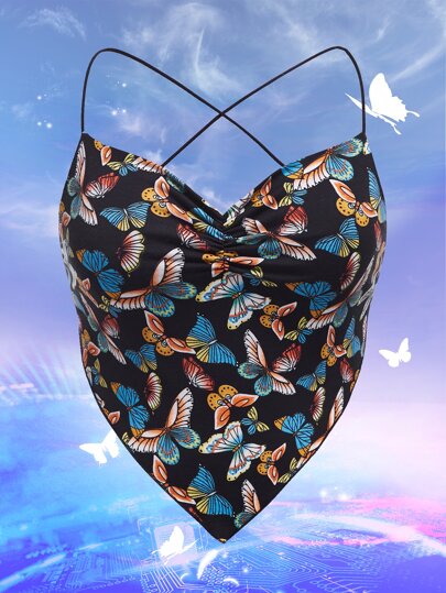 SHEIN ICON Plus Butterfly Print Ruched Lace Up Back Cami Top - Multicolor - View 1
