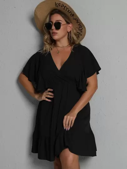 SHEIN Clasi Plus Butterfly Sleeve Ruffle Hem Dress - Black - View 1