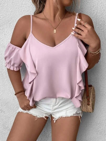 SHEIN Holidaya Plus Cold Shoulder Ruffle Trim Blouse - Baby Pink - View 1