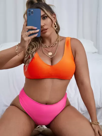 Plus Size Color Block High Waisted Bikini Set Summer Beach - Multicolor - View 1