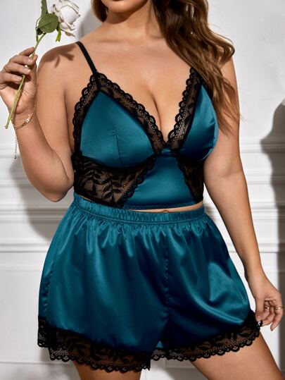 Plus Contrast Lace Satin PJ Set - Teal Blue - View 1