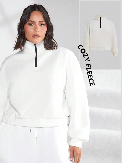SHEIN BASICS Plus Cozy Fleece Half Zip Drop Shoulder Sweatshirt - White - View 1
