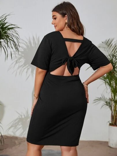 Plus Cut Out Tie Back Bodycon Dress - Black - View 1