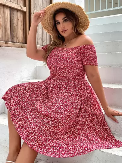 Plus Ditsy Floral Shirred Dress - Red and White - View 1