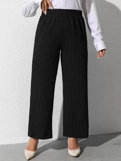 Mulvari Plus Elastic Waist Ribbed Knit Wide Leg Pants Without Belt - Black - View 1