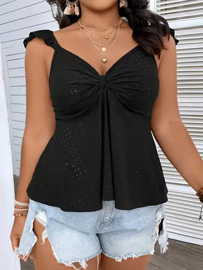 SHEIN Holidaya Plus Eyelet Embroidery Ruched Bust Ruffle Trim Peplum Top - Black - View 1