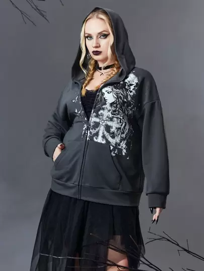 ROMWE Goth Plus Size Figure Graphic Zip Up Drop Shoulder Sweatshirt - Dark Grey - View 1