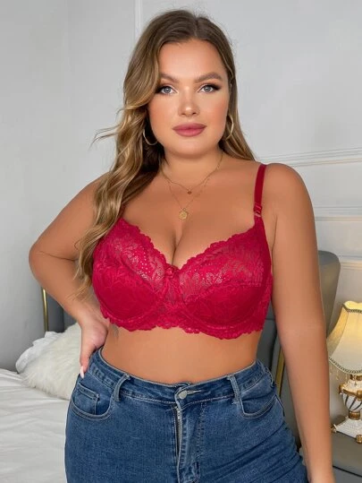 Plus Floral Lace Bow Front Underwire Bra - Burgundy - View 1