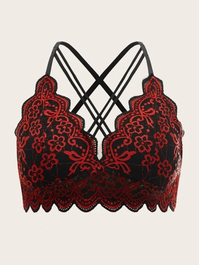 Plus Floral Lace Cross Back Bra - Burgundy - View 1