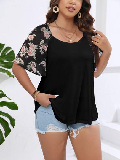 SHEIN LUNE Plus Floral Print Raglan Sleeve Top - Multicolor - View 1
