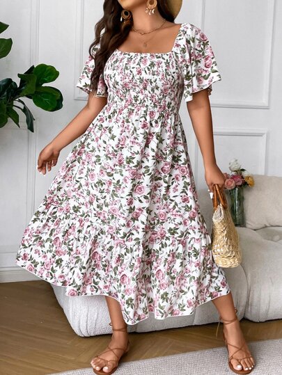 Calvaya Plus Floral Print Square Neck Ruffle Hem Dress Maxi Women Outfit - Multicolor - View 5